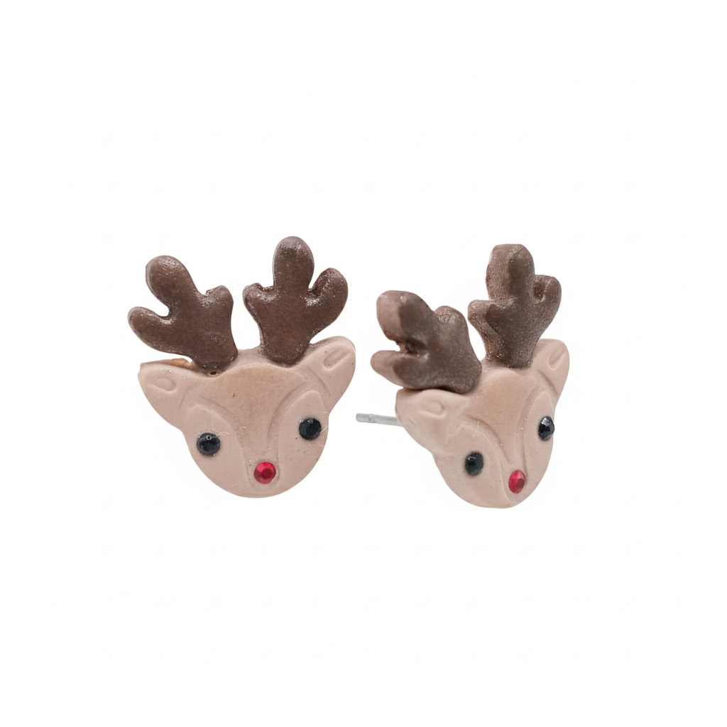 Aretes de arcilla polimérica en forma de reno, cuidadosamente modelados a mano, sin moldes. Los aretes son discretos y ligeros, miden aproximadamente 2 cm de largo por 2 cmde ancho. Están montados en una base de rodio libre de plomo y níquel.