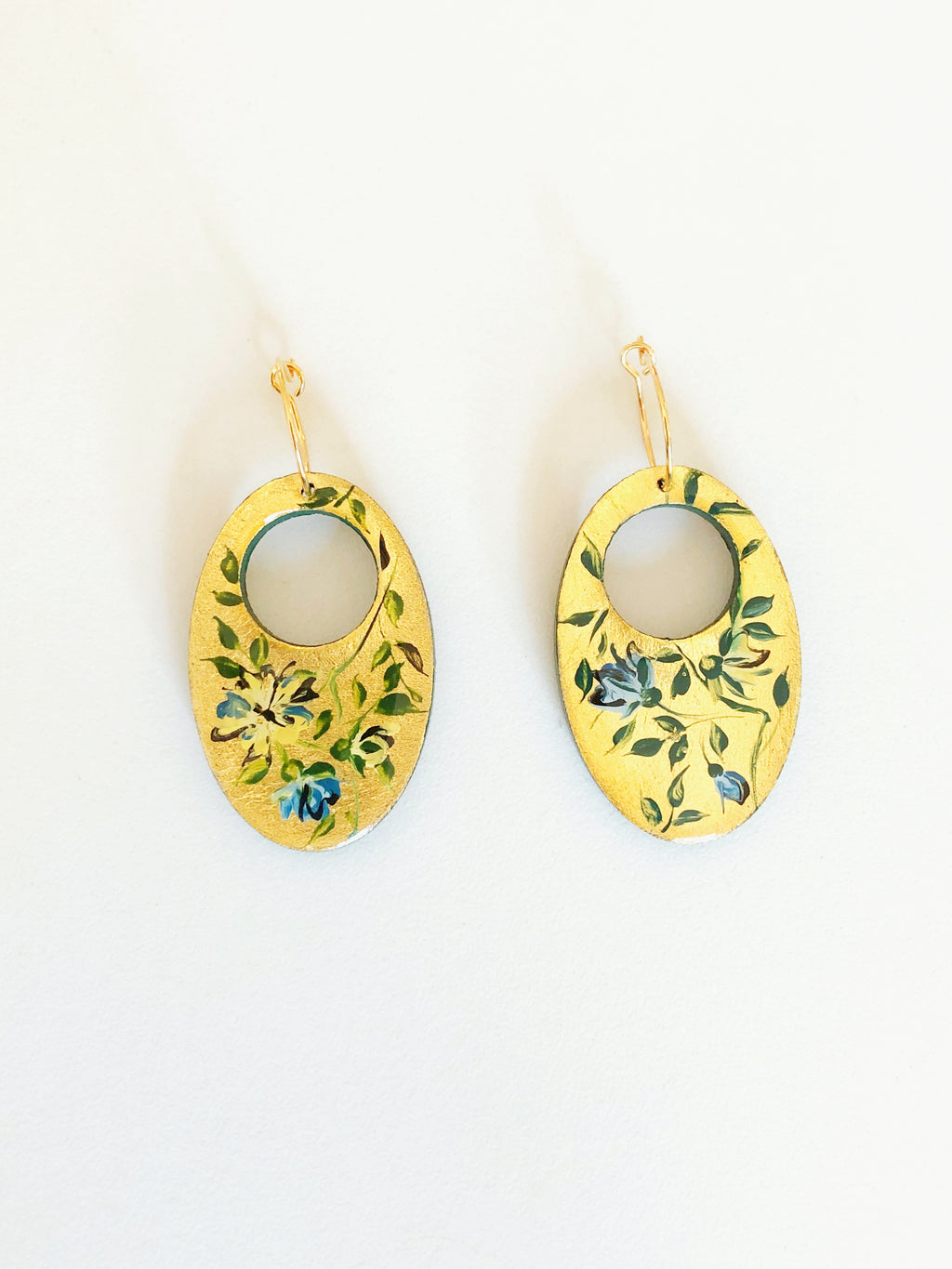 Aretes pintados a mano con pintura acrílica sobre madera dorada con hoja metálica.