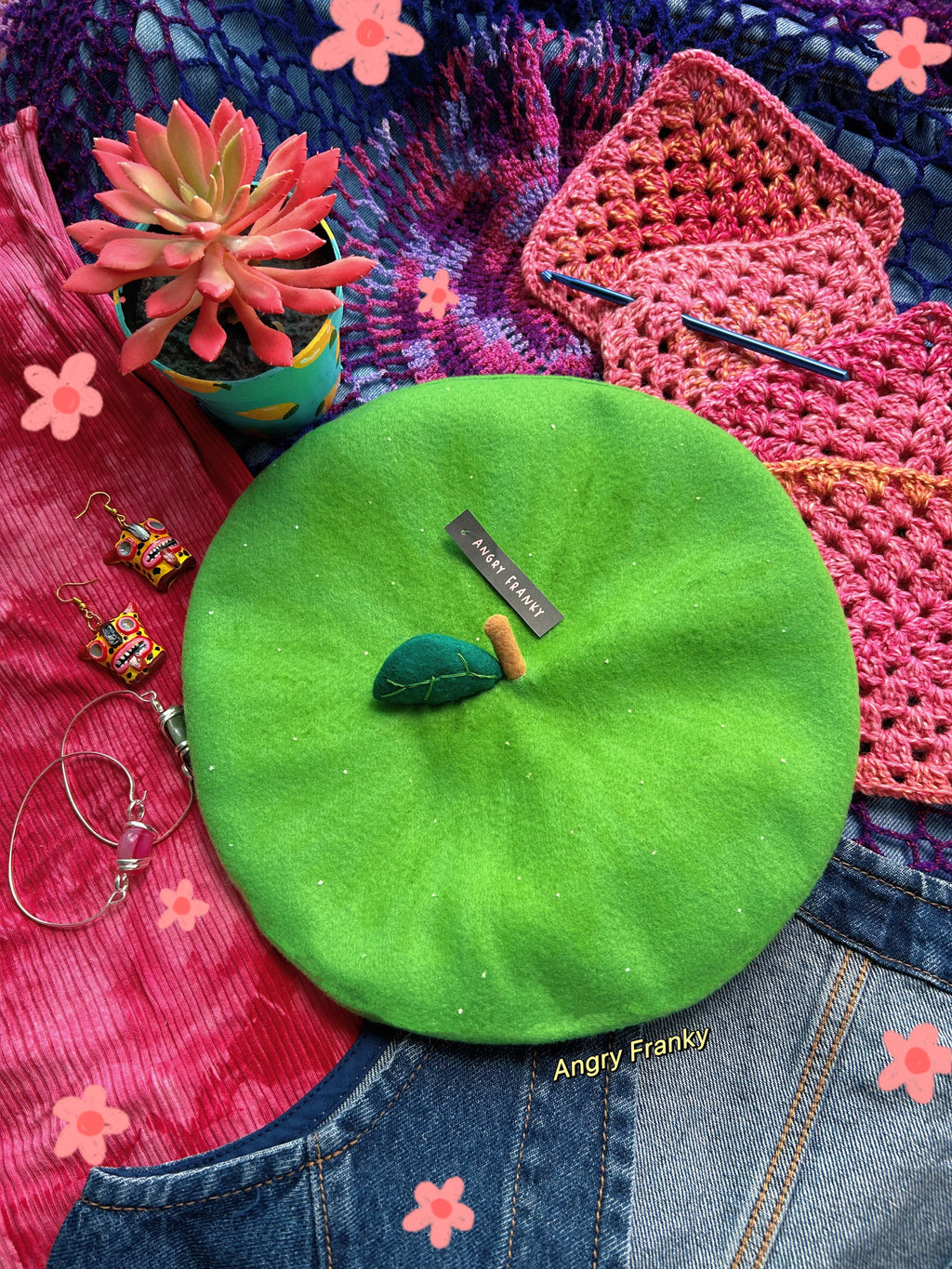 CARACTERISTICAS FÍSICAS: Boina de lana mixta prensada en color ranita con aplicaciones babidi boo ¡completamente echa a mano!