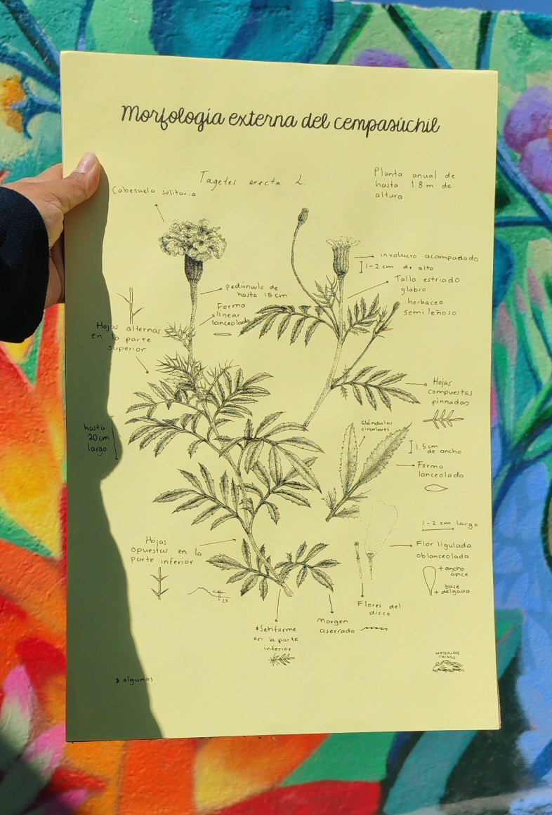 Risografía de ilustración Morfológica externa del cempasuchil.