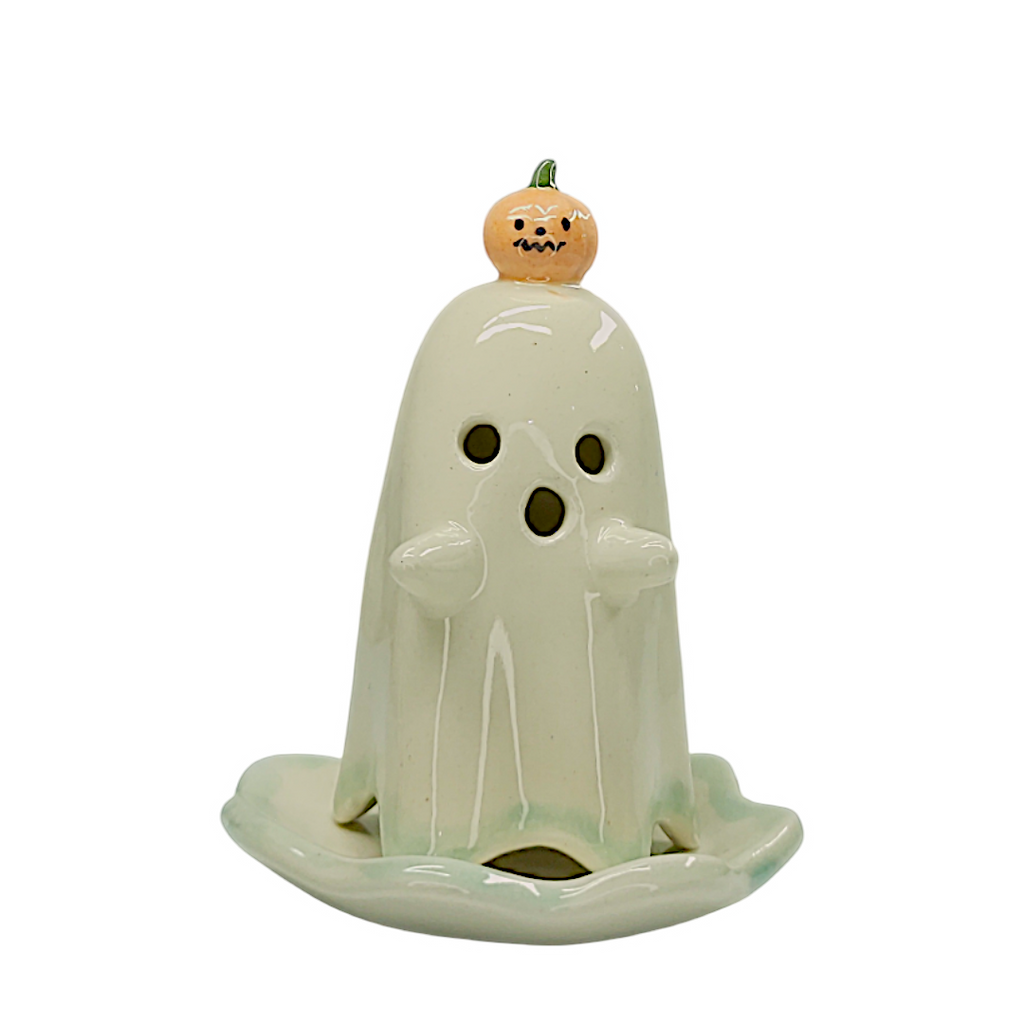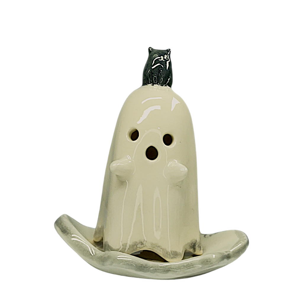 DESCRIPCIÓN: Divertida figura de cerámica con forma de tierno fantasma “coronado” con una pequeña calabaza o gatito negro. Coloca un cono de incienso en su interior y