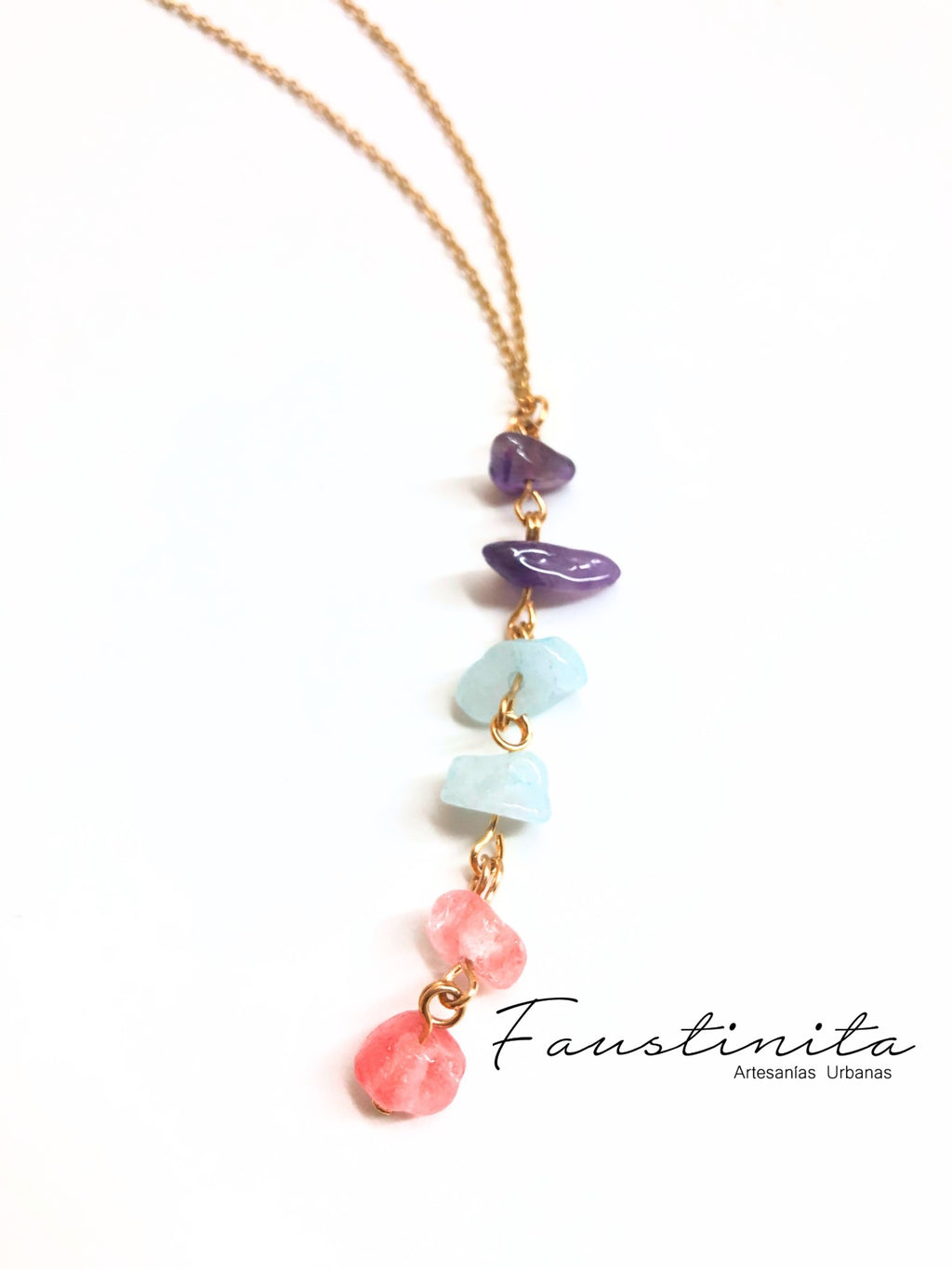 Collar con cadena dorada de acero inoxidable y chapa de oro de 45cm, dije con cuentas de aguamarina, cuarzo cereza y amatista