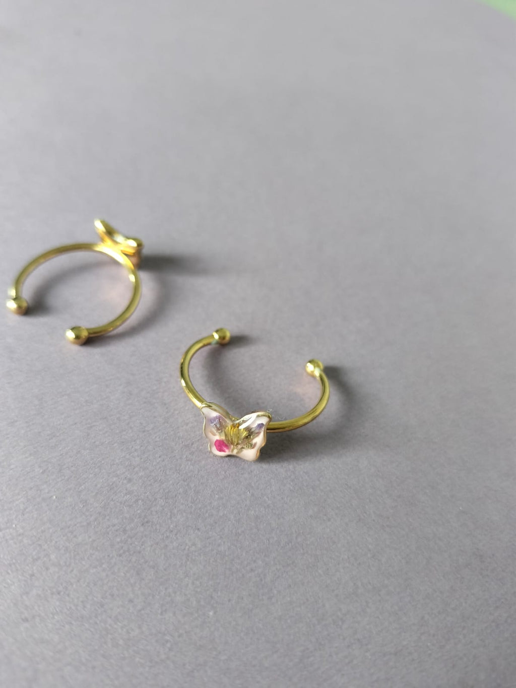 Anillo ajustable con flores miniatura preservadas y encapsuladas con resina UV sobre base de acero.
