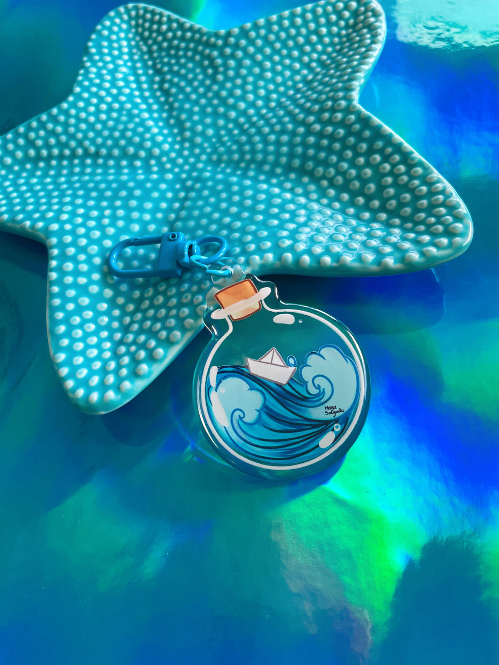 Llavero acrílico con diseño de botella, impresión por ambos lados cubierto con resina epoxica