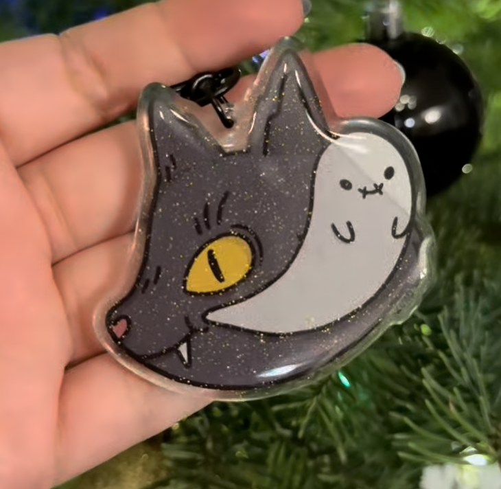 Llaveros de acrílico encapsulados con baño de resina y glitter.