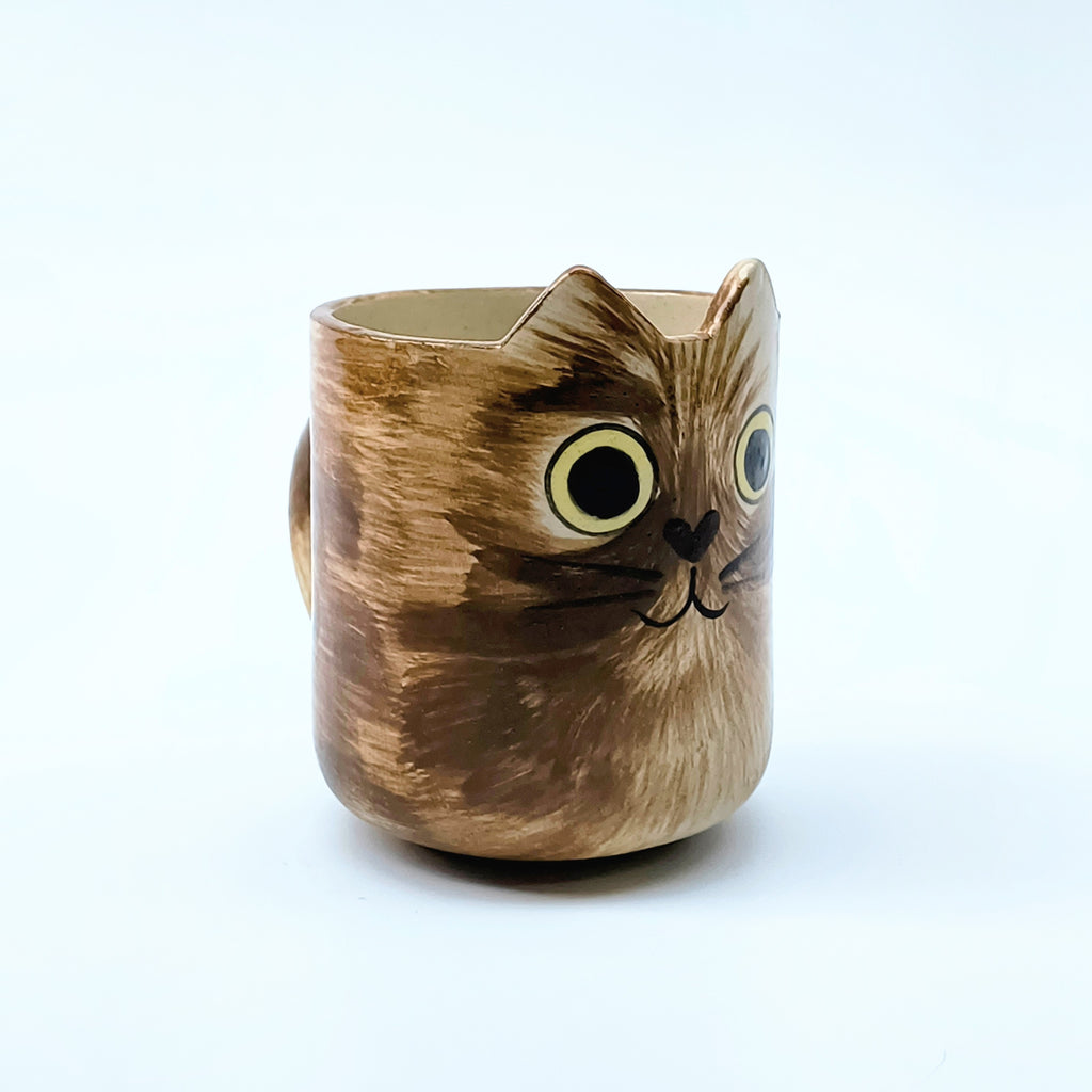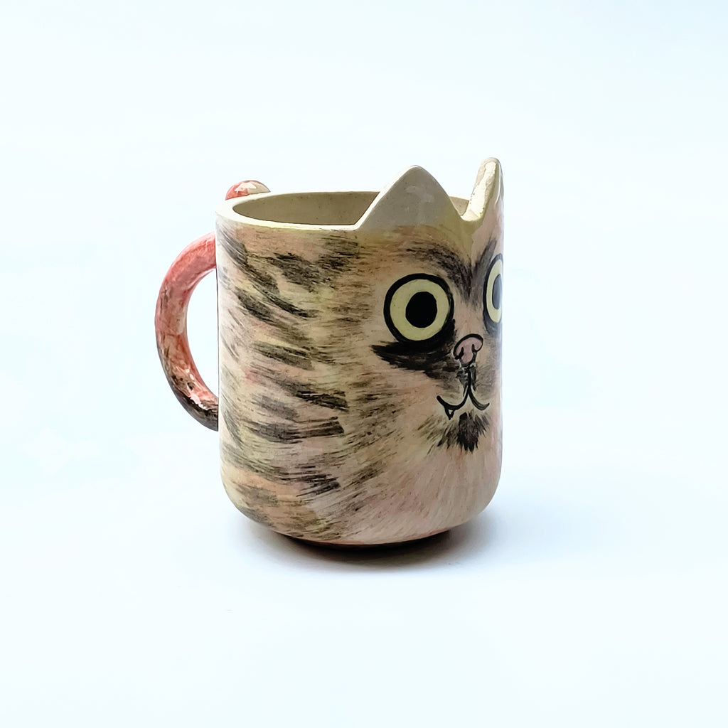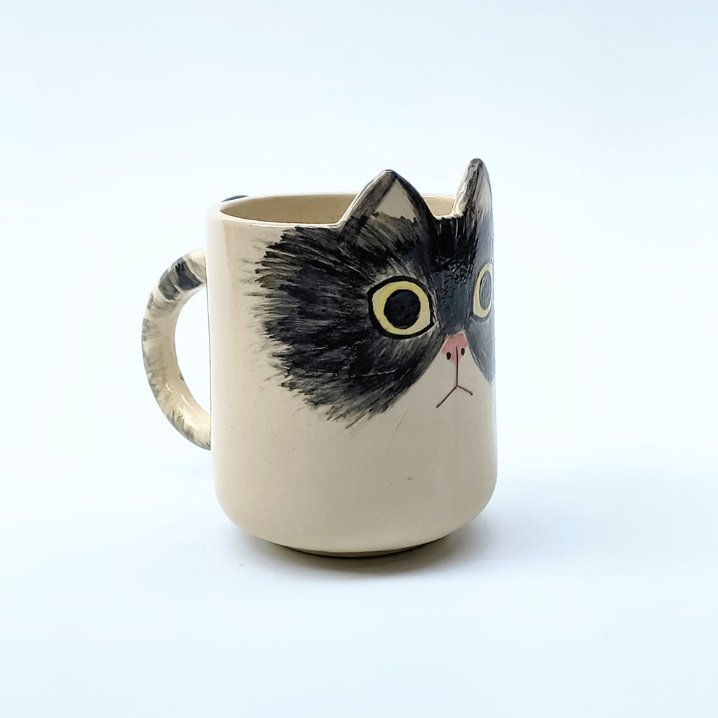 CARACTERISTICAS: Taza de cerámica decorada e inspirada en los michis, hecha y pintada 100% a mano. Es especial para los amantes de este animal. Tiene forma orgánica y el asa simula ser su cola.